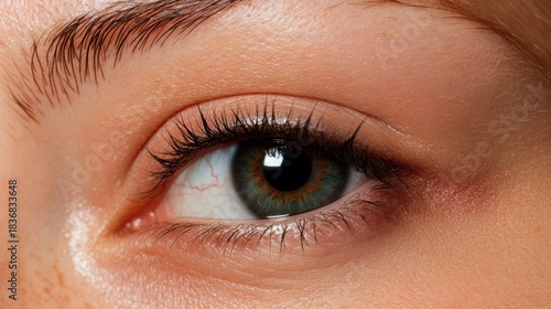 © Virtual Art Studio, Obraz premium A close-up of a human eye revealing intricate textures of the skin, eyelashes, and a green-brown iris.