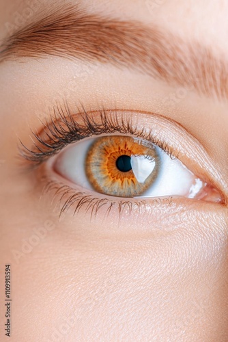 © Phisan, Obraz premium A close-up of a human eye showcasing vibrant brown iris, clear sclera, and well-defined eyelashes, highlighting natural beauty and detail.
