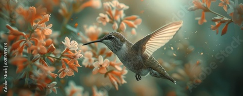 © peppastocker, Fototapeta premium A close-up of a hummingbird at a flower.
