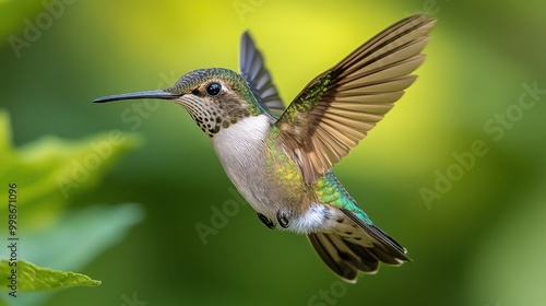 Fototapeta premium A close-up of a hummingbird hovering in mid-air, its wings a blur and its iridescent feathers shimmering in the sunlight
