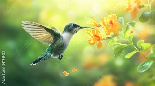 Fototapeta premium A close-up of a hummingbird hovering near a blooming flower, sipping nectar...