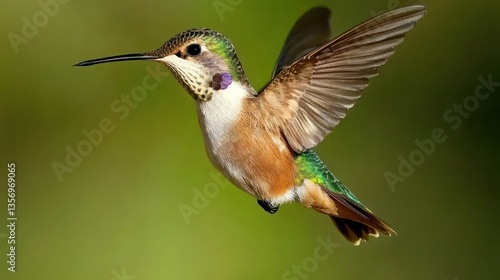 © Seak, Fototapeta premium A close-up of a hummingbird hovering near colorful blossoms.