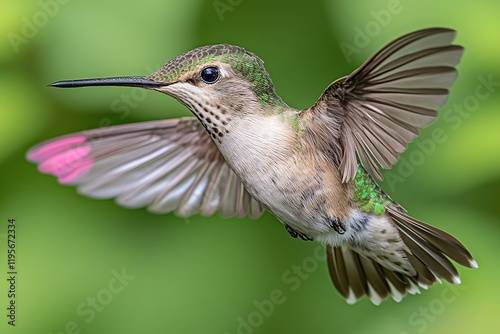 © Hafizh, Obraz premium A close-up of a hummingbird in flight, showcasing its vibrant feathers and delicate wings.