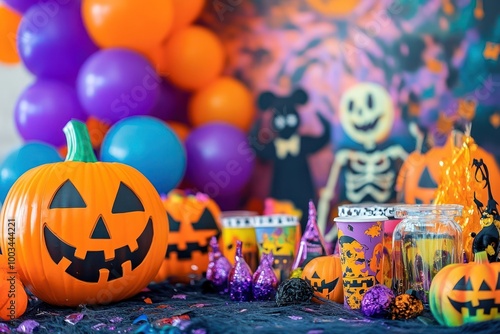 © Luxetify, Naklejka premium A close-up of a jack-o'-lantern on a table decorated for Halloween.