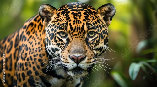 © Theeranan, Fototapeta premium A close-up of a jaguar in the Pantanal, highlighting the majestic and endangered wildlife of Brazil.