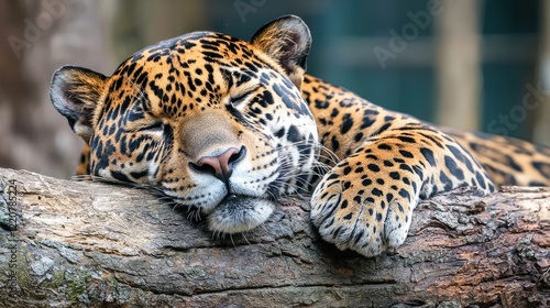 Obraz premium A close-up of a jaguar resting on a tree branch in the rainforest, looking...