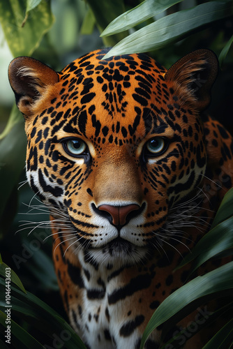 Naklejka premium A close up of a jaguar's face surrounded by green leaves