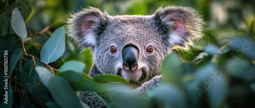 © BerkahStock, Fototapeta premium A close-up of a koala peering through eucalyptus leaves.