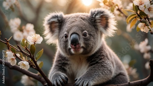 Fototapeta premium A close-up of a koala sitting on a branch surrounded by flowers in a serene...