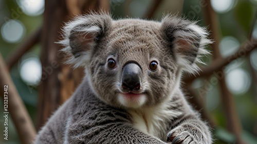 Fototapeta premium A close-up of a koala with soft gray fur and large round ears, set against a...