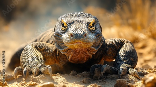 © Dikina, Obraz premium A close-up of a Komodo dragon in a natural setting.