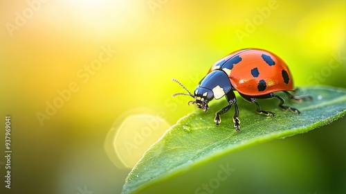 Fototapeta premium A close-up of a ladybug crawling on a fresh green leaf, capturing the small wonders of spring