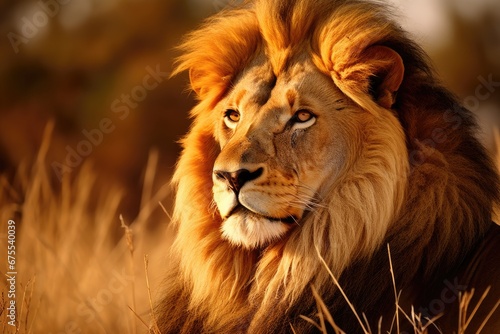 © Natalia, Fototapeta premium A close up of a lion in a field. Generative AI.