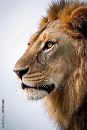 © haiqiang, Fototapeta premium a close up of a lion ' s face with a blue sky in the background
