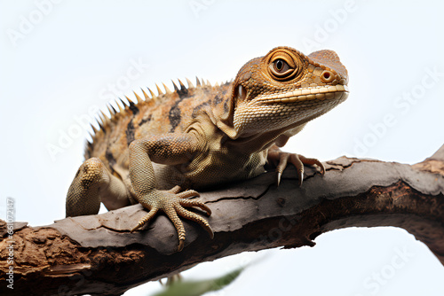 Obraz premium A close-up of a lizard on a tree branch on a white sky, Generative AI