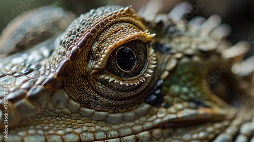 © Anna, Fototapeta premium a close up of a lizard's eye with a black spot on it's left eye and a black spot on the right eye of the lizard's left eye.