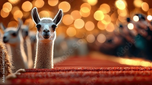 © dwi, Fototapeta premium A close-up of a llama looking directly at the camera, set against a blurred background of warm bokeh lights. The llama is the central focus, with a festive and