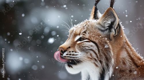 © Anna, Fototapeta premium a close up of a lynx with its tongue out and snow falling on it's face and it's tongue hanging out.