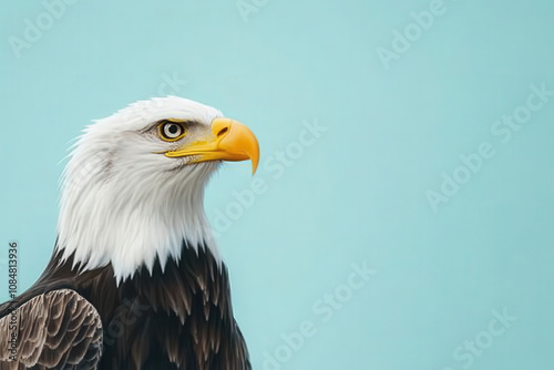 Obraz premium A close-up of a majestic bald eagle against a light blue background.