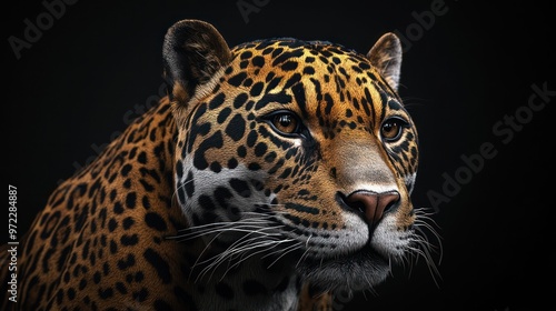 © Nathan, Naklejka premium A close-up of a majestic jaguar, showcasing its vibrant spotted coat and intense gaze against a dark background.