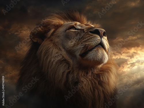 Fototapeta premium A close-up of a majestic lion gazing upward, showcasing its powerful mane against a dramatic, cloudy sky in warm light.