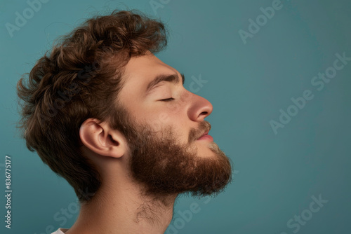 © MagnusCort, Fototapeta premium A close up of a man with beard and closed eyes looking to a side
