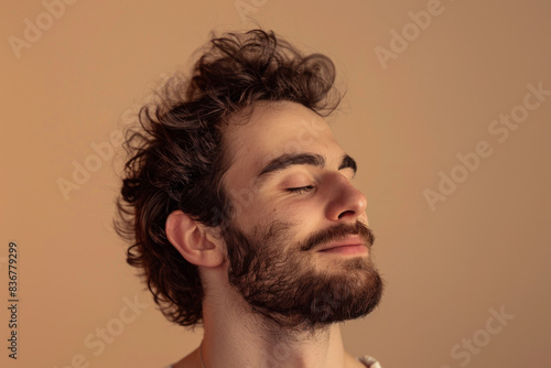 © MagnusCort, Fototapeta premium A close up of a man with beard and closed eyes looking to a side