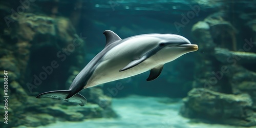 Fototapeta premium A close-up of a Maui dolphin swimming near the coast, highlighting its unique...