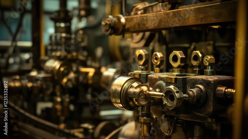 © Sampao, Fototapeta premium A close-up of a mechanical assembly line producing industrial parts.
