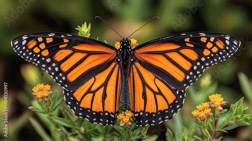 © Le, Fototapeta premium A close-up of a monarch butterfly on a milkweed plant, its vibrant orange and black wings a symbol of migration