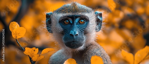 © 4575, Fototapeta premium A close-up of a monkey surrounded by vibrant orange leaves.