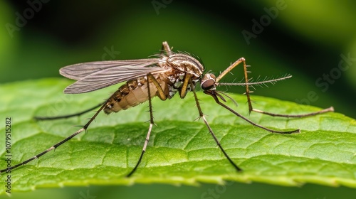 Fototapeta premium A close-up of a mosquito resting on a green leaf.