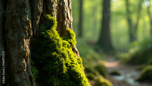 Obraz premium A close-up of a moss-covered tree trunk in a serene forest bathed in soft...