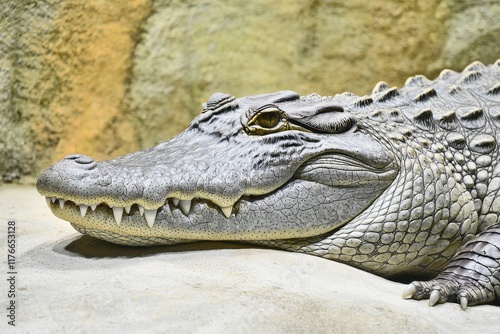 © Nico, Fototapeta premium A close-up of a Nile crocodile basking on the riverbank with its mouth slightly open