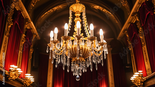 © Rhony, Obraz premium A close-up of a ornate chandelier hanging in a dimly lit theater