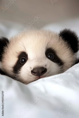 © Wall, Naklejka premium A close-up of a panda bear on a white bed with its black facial marks
