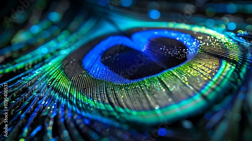 © Ghazala, Naklejka premium A close-up of a peacock feather with its vibrant blue and green colors shimmering in the light. ISO EOS R6 Mark II Mirrorless +8