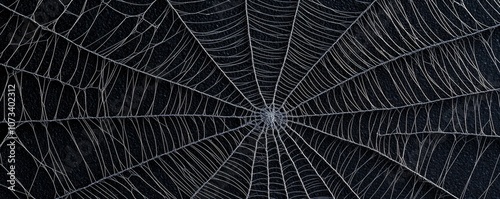 © Naphol, Obraz premium A close-up of a perfectly crafted spider web, showcasing intricate patterns and delicate threads against a dark background.