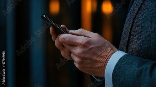 Obraz premium A close-up of a person's hands holding a smartphone, showcasing a modern and professional setting, This image is perfect for business, technology, or communication-related content,