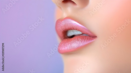 Obraz premium A close-up of a person's lips showing a glossy, pink lip color against a...
