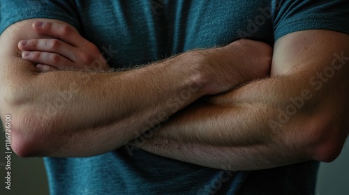 Fototapeta premium A close-up of a person with their arms crossed, looking serious or defensive