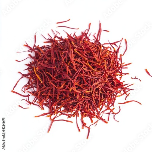 © Sabein, Naklejka premium A close-up of a pile of dried saffron threads on a white background.