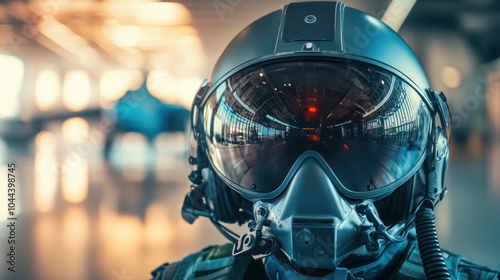 © Ferman Bagus Istuhri, Fototapeta premium A close-up of a pilot wearing a helmet and visor in an aviation environment.