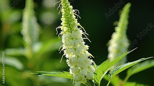 © Anna, Naklejka premium a close up of a plant with white flowers and green leaves in the foreground and a blurry background in the background. generative ai