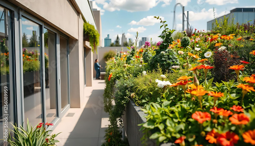 © cd, Fototapeta premium a close up of a planter on the side of a building, Urban Gardening, Autunm plants in big concrete planter on the street, created with generative ai