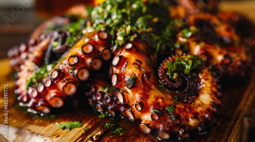 Fototapeta premium A close up of a plate with octopus and garnish on it, AI