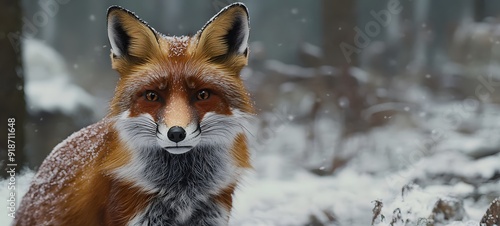 Obraz premium 5. A close-up of a playful red fox in a snowy forest, with its fur...