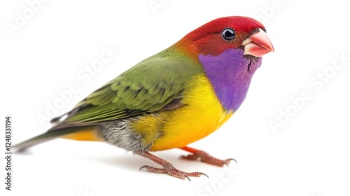 © Jersco, Fototapeta premium A close-up of a pretty Gouldian Finch from Australia, perched gracefully, isolated on a pure white background