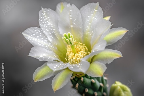 Obraz premium A close-up of a pristine white cactus flower with dew drops, showcasing...
