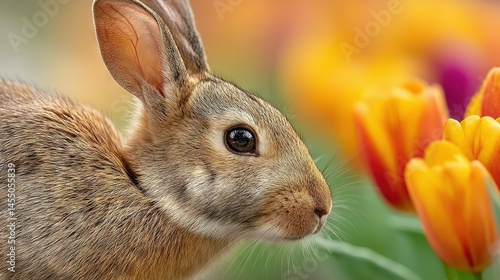 © Anna, Fototapeta premium A close-up of a rabbit beside a flower with an orange and yellow tulip blur in the background